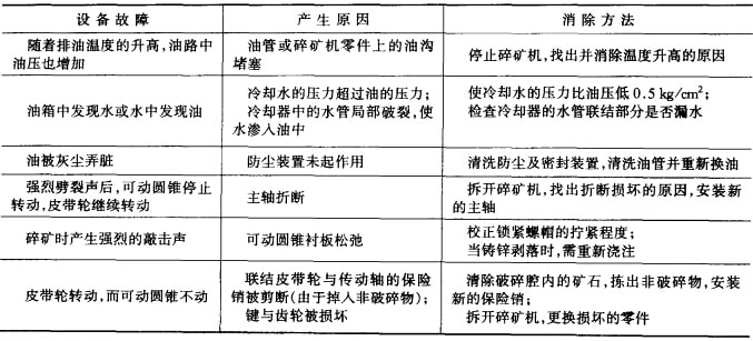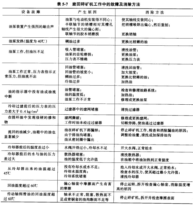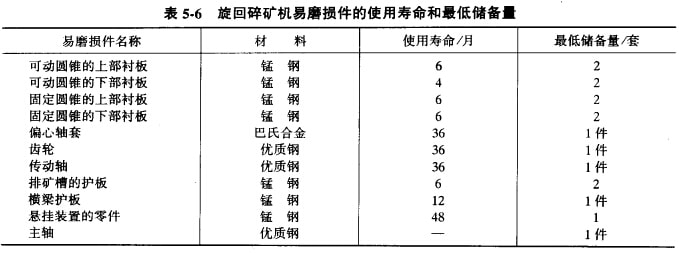旋回破碎機(jī)主要易磨損件的使用壽命和最低儲(chǔ)備量可參見表5-6;旋回破碎機(jī)工作中產(chǎn)生的故障及其排除方法可參見表5-7。