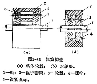 在圖1-33中,圖a)發(fā)示整體式輪轂。輥?zhàn)犹淄?與輪轂用三塊錐形鐵件5和螺柱4,螺母進(jìn)行緊固。圖b)為雙輪轂式,輪轂3制成為兩個(gè)截錐體,錐面與輥?zhàn)犹缀?jiǎn)相應(yīng)的內(nèi)錐面相配合,兩片輪轂用螺柱4和螺母加以緊固。