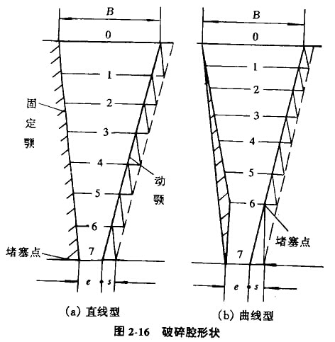 破碎腔形狀設(shè)計(jì)的是否合理,直接影響破碎機(jī)的破碎效果、生產(chǎn)率、能量消耗、襯板磨損和破碎比等重要指標(biāo)。破碎腔形狀如圖2-16所示,有直線型破碎腔和曲線型破碎腔。實(shí)踐與理論分析說明曲線型破碎腔優(yōu)于直線型破碎腔。因此,采用曲線型破碎腔是現(xiàn)代破碎設(shè)備結(jié)構(gòu)的發(fā)展方向。