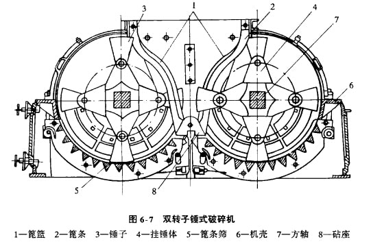 雙轉(zhuǎn)子錘式破碎機(jī)如圖6-7所示。在機(jī)殼6內(nèi),平行安裝有兩個(gè)轉(zhuǎn)子。轉(zhuǎn)子由臂形的掛錘體4及鉸接在其上的錘子3組成掛錘體安裝在方軸7上。錘子是多排式排列,相鄰的掛錘體互相交叉成十字形。兩轉(zhuǎn)子由單獨(dú)的電動(dòng)機(jī)帶動(dòng)作相向旋轉(zhuǎn)。