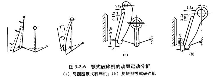 顎式破碎機動顎運動的軌跡見圖3-2-6。在簡擺型顎式破碎機中,動顎以中心軸為中心而擺動一段圓弧,其下端的擺動行程較大,上端較小。擺動行程可分為水平的與垂直的兩個分量,視結(jié)構(gòu)的幾何關(guān)系而定,其比例大致如圖3-2-6a所示。復(fù)擺型顎式破碎機的運動軌跡較為復(fù)雜,動領(lǐng)上端的運動軌跡近似為圓形,下端的運動軌跡近似為橢圓形。其行程的水平與垂直分量的比例大致如圖3-2-6b所示。簡擺型與復(fù)擺型領(lǐng)式破碎機動領(lǐng)運動的另一個區(qū)別,就是在簡擺型中,動顎上端均下端同時靠近固定顎或遠離固定顎,即動顎上端與下端的運動是同步的;而在復(fù)擺型中,動顎上端與下端的運動是異步的,例如,當(dāng)動顎上端朝向固定顎運動,下端卻向相反于固定顎的力向運動。換句話說,在某些時刻,動顎上端正在破碎物料,下端卻正在排出物料,或反之。