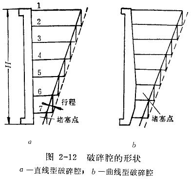 破碎腔的形狀有直線型和曲線型兩種。若兩種破碎腔的給礦口寬度、排礦口寬度、動顎的擺動行程和擺動次數(shù)均相同時,礦石在破碎腔內的流動狀態(tài)如圖2-12所示。圖中實線表示顎板閉合時的位置,虛線表示顎板后退最遠時的位置。