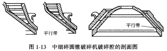 中細(xì)碎圓錐破砷機(jī)可分為彈簧型圓錐破碎機(jī)及液壓型圓錐破碎機(jī)兩種。液壓型圓錐破碎機(jī)又有單缸及多缸兩種。多缸液壓圓錐破碎機(jī),由于油路比較復(fù)雜,而且工作沒(méi)有單缸液壓的可靠,因此在目前已經(jīng)不再制造了,只有在已有這種設(shè)備的廠礦中才能見(jiàn)到。以上兩種圓錐破碎機(jī),每種又可分為標(biāo)準(zhǔn)型、中間型及短頭型三種。這三種型式破碎機(jī)的基本構(gòu)造和工作原理完全相同,只是在破碎腔的形狀略有不同,如圖1-13所示。
