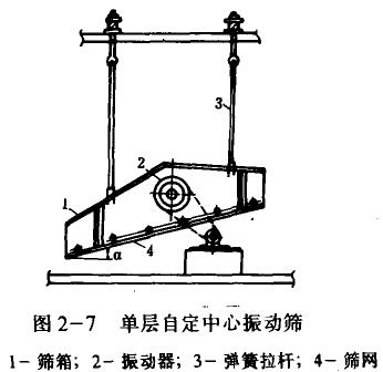 自定中心振動篩與慣性振動篩的主要區(qū)別在于,慣性振動篩的傳動軸與皮帶輪是同心安裝的,而自定中心振動篩的皮帶輪與傳動軸是不同心的。圖2-7為單層自定中心振動篩。這種篩主要是由篩箱、篩網(wǎng)、振動器和彈簧拉桿組成的。篩箱1由四根帶彈簧的拉桿懸掛在支架上。彈簧是用來支撐篩箱的,同時又可起到減振作用,從而保護了與之接觸的建筑物等構(gòu)件。篩面與水平面的傾角為15-25°篩箱振幅的調(diào)整,可通過增減偏心重塊的數(shù)量來實現(xiàn)。