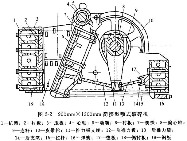 圖2-2中的17即墊板調節(jié)裝置。在后推力板支座后面故入一組調整墊板。改變墊板的數(shù)目或厚度,使后拉力板前移或后退,達到調節(jié)排料口寬度的目的。