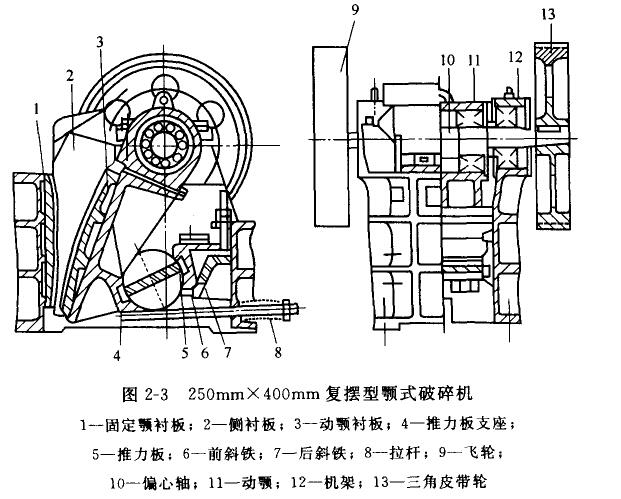 圖2-3中的斜鐵6和7就是調節(jié)排料口寬度用的。利用螺釘與螺帽或者用蝸桿、蝸輪或鏈式傳動裝置,使后斜鐵升降。前斜鐵安在機架兩個側壁的導槽內,只能水平移功。當后斜鐵被提起,由于斜面關系使前斜鐵沿導槽向前移動,則推力板及動顎前移,排料口寬度減小。反之,當后斜鐵下降時排料口寬度將增加。