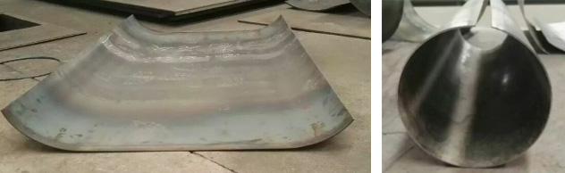 此方法在NHX500選粉機(jī)制作中得到檢驗(yàn),收到良好效果,預(yù)彎成品如圖1、圖2。對于日常制作過程中較薄板的卷圓件可采用此方法(3~6mm),既能節(jié)約材料,又能提高效率,保證質(zhì)量。