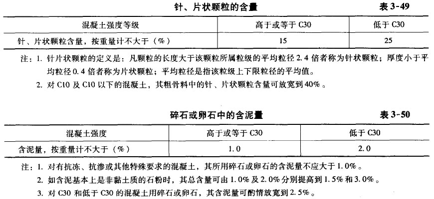 ②針、片狀顆粒含量:碎石或卵石中針、片狀顆粒含量.應符合表3-49的要求。