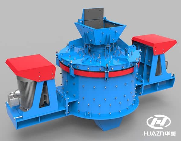 物料經(jīng)由進料斗進入破碎機內(nèi)高速旋轉(zhuǎn)的葉輪,被迅速加速,以50~70M/S的速度從葉輪均布的導流板和流道襯板上拋射出去,沖擊到破碎腔的反擊板上,破碎和被反彈,改變運動方向并與葉輪發(fā)射出來的物料碰撞。物料經(jīng)過多次碰撞、摩擦破碎作用,由下部排料口排除。
